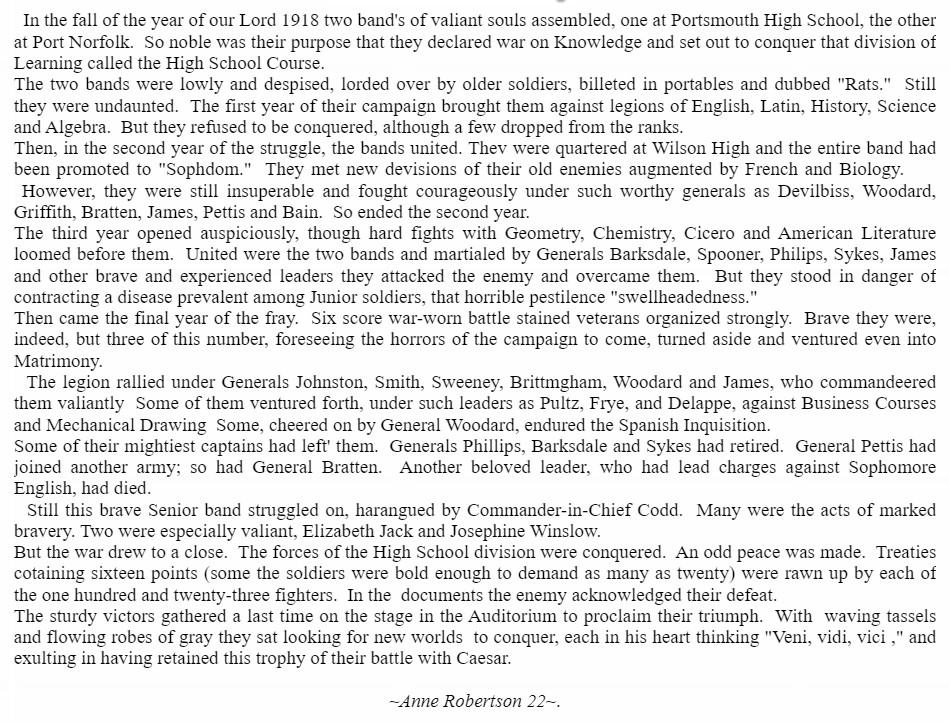 The Class Roster and pictures are as represented in the Woodrow Wilson High School, Portsmouth, Virginia yearbook or annual of the year indicated on the page.  The Roster may not be complete and pictures and names may have been removed by request of the person involved. Also, it does not officially indicate the year of graduation and/or that the party in question graduated.  If you are not represented in your class, you will be added to the last page of the year and you may submit a photo to be added.  All information on these pages came from the yearbook represented and alumni who have passed on information and may not be accurate.