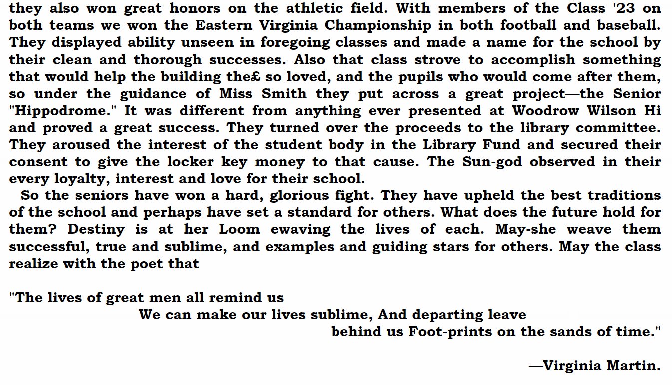 The Class Roster and pictures are as represented in the Woodrow Wilson High School, Portsmouth, Virginia yearbook or annual of the year indicated on the page.  The Roster may not be complete and pictures and names may have been removed by request of the person involved. Also, it does not officially indicate the year of graduation and/or that the party in question graduated.  If you are not represented in your class, you will be added to the last page of the year and you may submit a photo to be added.  All information on these pages came from the yearbook represented and alumni who have passed on information and may not be accurate.