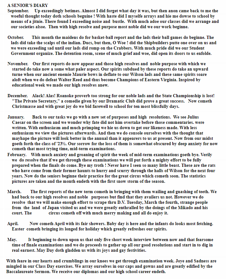 The Class Roster and pictures are as represented in the Woodrow Wilson High School, Portsmouth, Virginia yearbook or annual of the year indicated on the page.  The Roster may not be complete and pictures and names may have been removed by request of the person involved. Also, it does not officially indicate the year of graduation and/or that the party in question graduated.  If you are not represented in your class, you will be added to the last page of the year and you may submit a photo to be added.  All information on these pages came from the yearbook represented and alumni who have passed on information and may not be accurate.